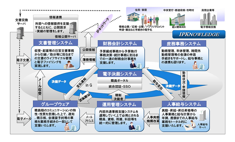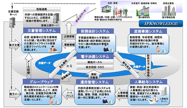 当社がこれまで公団体向けに提供してきた内部情報統合ソリューション「IPKNOWLEDGE」のノウハウをもとに、財務会計、人事給与、庶務事務、文書管理、旅費管理、グループウェア、電子決裁などを統合的に管理するソリューションを、新たに独立行政法人向けに提供します。