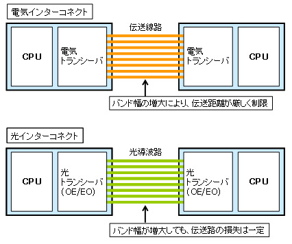 近年、スパコンの演算処理速度は1年半の間に約2倍のペースで高速化しています。そして2020年ごろをターゲットに、エクサフロップス級のスパコンの検討が進められています。超高速での演算を実現するには、計算機のCPUから数十テラビット毎秒におよぶデータを入出力するための大容量・高速インターコネクト技術が必要です。しかし、従来から利用されている銅配線による電気インターコネクト技術では、伝送速度の高速化の限界が近いと言われています。このため、CPU間を光で接続する光インターコネクトの適用が検討されています。