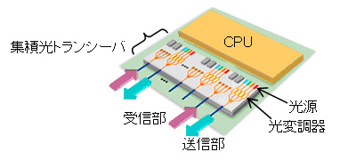 今回開発した技術により、小型で低消費電力な光送受信器をCPUパッケージに搭載可能になります。将来のエクサフロップス級スパコン(注5)やハイエンドサーバなどにおけるCPU間の光インターコネクトへの適用により、超高速コンピュータの実現が期待されます。