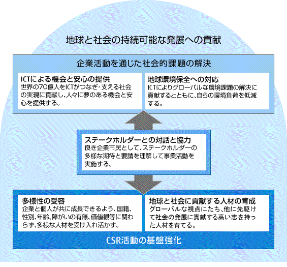2010年12月に制定した「CSR基本方針」、その実践にあたり優先的に取り組むべき5つの重要課題の説明や、富士通グループの理念・指針であるFUJITSU Way、CSR推進体制などについて紹介しています。