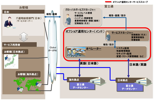 本サービスは、インドに拠点を置く富士通コンサルティングインディア(本社:インド プネ市、以下、FCIPL)から、リモートにてお客様のシステム運用を代行するものです。富士通グループの持つさまざまな最新テクノロジーとノウハウを結集し、言語、技術、文化の違いなど、従来のオフショア利用時のお客様の不安を解消した、高品質なシステム運用を実現します。また、低価格でのサービス利用が可能なため、お客様はシステム運用コストを削減するとともに、運用スタッフをビジネスのコア業務へシフトするなど、経営の観点からの最適化を実現できます。