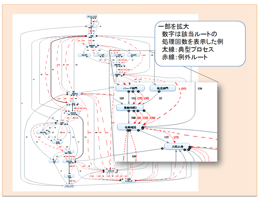流れ図では、ログに基づいて典型プロセス(=メインルート)と判断されたルートが太線で表示されるほか、各ルートの実行回数や平均処理時間が表示されるため、業務プロセスの実態が一目でわかり、想定外の処理や非効率な処理も容易に見つけることができます。