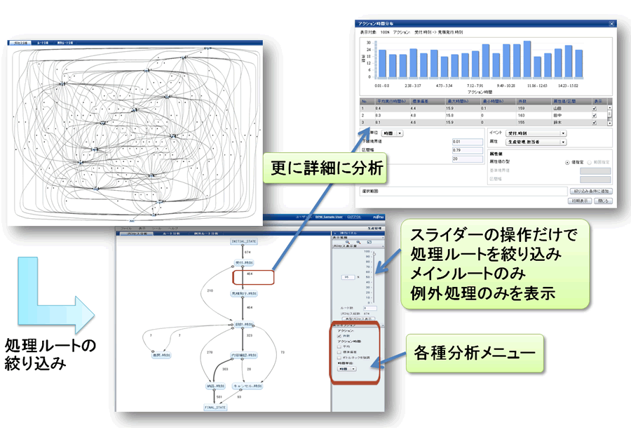作成した流れ図から、簡単に業務分析することができます。マウスによるスライダー操作や、分析メニューのチェックだけで、プロセスを絞り込むことができ、また、処理の頻度や、内容による処理時間の平均、バラツキ、処理ルートごとにかかる工数の計算など、さまざまな観点での分析が可能です。マウス操作だけで簡単にできるため、プロセス分析の専門スキルは不要で、業務の問題箇所を客観的に特定できます。