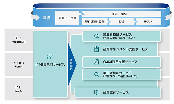 具体的には、第三者の立場で成果物とプロセスを検証する第三者検証サービスや、稼働中のシステムの利活用状況を診断することで運用リスクを明確にし、次の施策を提案するICT健康診断サービスなどを提供します。