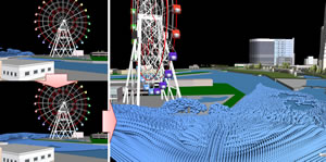 今村教授は長年にわたって津波を研究されており、震源から伝わる津波の伝播を解析する津波伝播の二次元シミュレーション技術を開発されています。このシミュレーション技術は海岸部への津波の到達時刻や波高の計算に広く活用されていますが、建物や地形の影響を大きく受ける津波による都市の浸水や河川遡上を扱うには限界がありました。