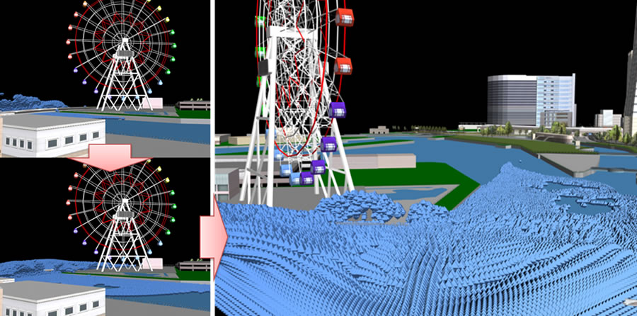 津波のシミュレーションは、以前から世界中で行なわれてきましたが、建物に及ぼす津波の力の計算、市街地の浸水、河川の遡上のシミュレーションに関しては、建物や堤防などの三次元的な形状が津波の威力や遡上速度に影響を与えるため、それらの情報を盛り込んだ三次元のシミュレーションが必須となります。このようなシミュレーションには500台のPCを利用して並列計算を行うPCクラスタの技術を利用しても5日間かかるほどの膨大な計算が必要となるため、ほとんど行なわれていないのが現状です。
