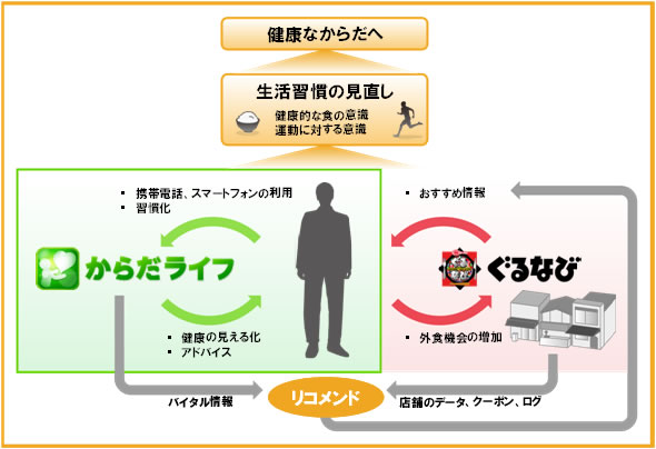 株式会社ぐるなび(本社:東京都千代田区、代表取締役社長:久保 征一郎、以下、ぐるなび)と富士通株式会社(本社:東京都港区、代表取締役社長:山本 正已、以下、富士通)は、国内最大級のグルメ情報サイト「ぐるなび」と富士通の携帯電話・スマートフォンを活用した健康増進支援サービス「からだライフ(注1)」を連携させ、提携企業の従業員の生活習慣見直しと周辺地域の店舗への送客を目的とした新サービスの実証実験を、2012年2月初旬から3月中旬まで行います。