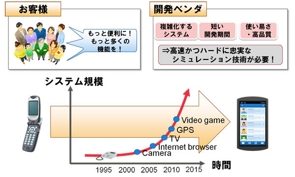 ARMコアは、携帯電話や電子機器のCPUとして世の中のさまざまな機器やシステムで利用されています。こうした機器やシステムはこの10年で飛躍的に複雑化していますが、競争に打ち勝つために開発期間(Time to Market)は短くなる一方です。限られた開発期間の中で使い易さや品質も追及しなければならないため、新しい機器やシステムを短期間で開発するための支援技術が必須となっています。