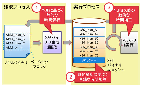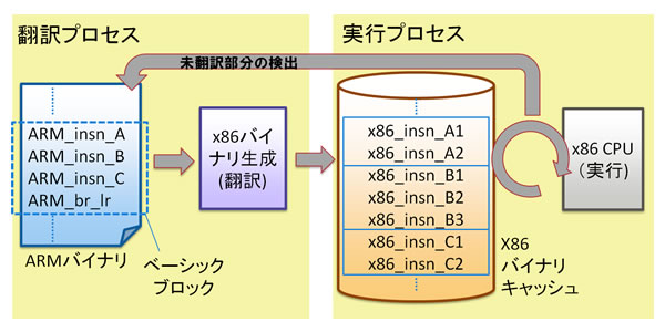 図2は従来のJITコンパイル方式の処理の流れです。ARMの実行プログラムはベーシックコードと呼ばれるブロック単位でパソコン上のx86(注4)の実行プログラムに翻訳され、実行プロセスにてそのプログラムが実行されます。ここでx86の実行プログラムはメモリにキャッシュされ、その後、キャッシュにヒットする限りは翻訳プロセスを繰り返さずに実行プロセスのみで再実行が可能です。JITコンパイル方式では機能レベルのコードに限定されるため、命令あたりのコード数が少なく負荷も軽くなります。また一般的にキャッシュのヒット率が高いため高速な実行が可能となります。