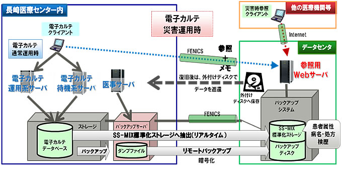 独立行政法人国立病院機構 長崎医療センター(所在地:長崎県大村市、院長:米倉 正大、以下、長崎医療センター)と富士通株式会社(本社:東京都港区、代表取締役社長:山本 正已 以下、富士通)は、共同で、被災時にも地域における診療を継続するためのバックアップシステムを構築し、このたび本格運用を開始しました。