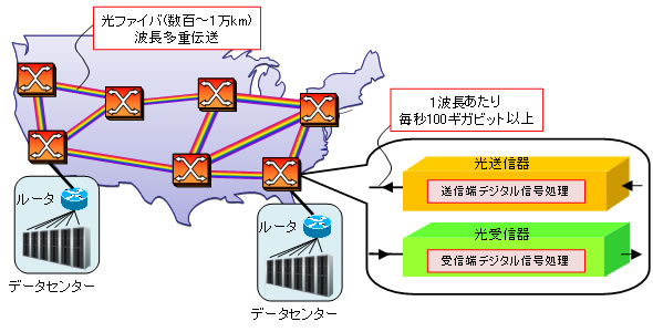 図1 基幹伝送ネットワークとデジタル信号処理を用いた超高速光送受信器