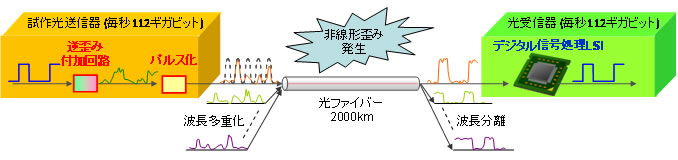 毎秒100ギガビットを超える超高速信号は、数百km以上の長距離を光ファイバーで伝送されるにつれて、非線形光学効果(注3)によって波形に歪みが累積し、やがて信号を正しく受信することが困難になります。これに対して、信号の歪みを補正してきれいな波形に復元する非線形補償技術(注4)の研究が行われています。この技術が実現すれば、高価で消費電力の高い再生中継器を用いずに信号の到達距離を延ばすことが可能となるため、ネットワークの低コスト化・消費電力削減につながります。