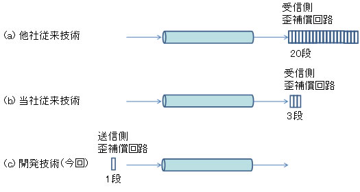 本技術を、毎秒112ギガビットの伝送実験に適用した結果、他社従来技術で20段の補償回路を用いて得られるよりも高い信号品質が、開発技術ではわずか1段の回路で得られることを確認しました(図3)。回路規模が小型化されることにより、大幅な低消費電力化が可能となります。