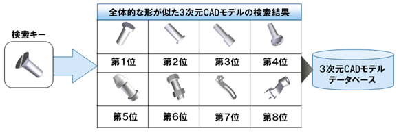 従来、3次元CADモデルの検索では、部品名などのキーワードによるテキスト検索や、全体的な形が似た3次元CADモデルを検索する全体形状検索(図1)が行われていました。