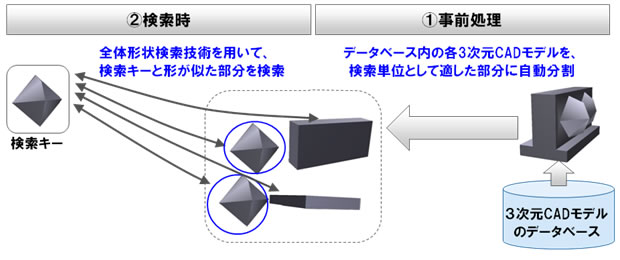 )。設計者が検索キーとして形状を指定すると、分割したモデルの中から全体形状検索技術を用いて形が似た部分が検索されます(図2の