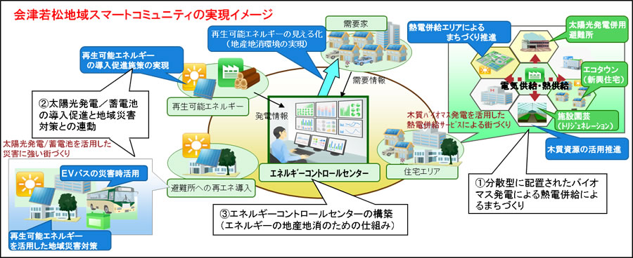 上記調査結果を踏まえ、富士通、会津若松市、東北電力の3者は、「福島県復興計画(第1次)」を実現するため、(1)分散型に配置されたバイオマス発電による熱電併給によるまちづくり、(2)太陽光発電/蓄電池の導入促進と地域災害対策との連動、(3)エネルギーコントロールセンター(注4)の構築、などの具体的な計画を策定します。