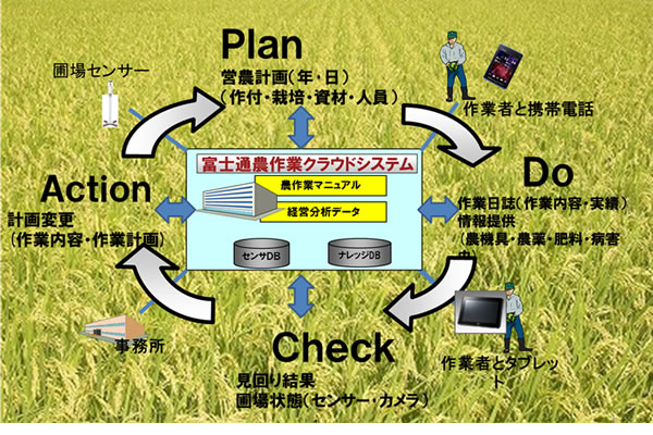 大規模な水稲生産などの土地利用型農業において、クラウド技術、センサーネットワーク、携帯端末を駆使し、従来、経験と勘を中心に行われていた営農のマニュアル化、標準化を図り、農作業従事者の作業スキルの差を最小化し、農作物の付加価値向上を目指します。
