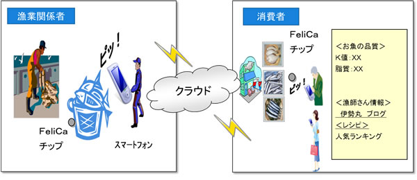 産地側において、産地や魚の鮮度、脂質などの品質情報をクラウド上に登録し、スーパーなどで消費者がスマートフォンからその情報を確認・利用できるなど、魚価の向上、産地のブランド化につながる要素技術の実証研究を行います。