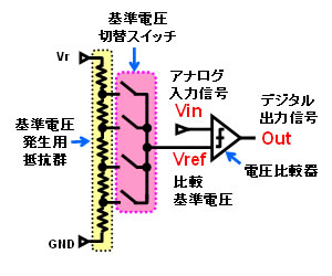 アナログデジタル変換器の動作は、一般的に外部から入力されたアナログ信号の値と内部で生成した基準値とを比較することでデジタル値に変換を行います。しかし、基準値を変更するためにスイッチが必要となり、半導体の微細化が進むにつれ、このスイッチの高速切り替え性能などを保証することが困難になっていました。