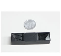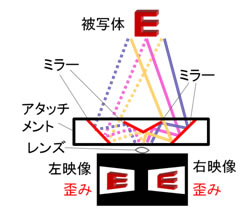 左目用と右目用の映像を一つの撮像素子へ取り込むアタッチメントを携帯電話やスマートフォンに装着可能なサイズにするため、独自の映像処理技術と組み合せて小型化を図りました(図1(a))。開発したアタッチメントでは、図1(b)の左目用と右目用の映像に示す歪みが発生しますが、この歪みをカメラ内の撮像素子に取り込んだ後で補正処理を行うことにより、アタッチメントを57ミリメートル(mm)×14mm×14mmのサイズに小型化しました。また平面ミラー4枚で構成することで、市販品と比べてコストを約1/10に削減しました。