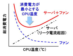 CPUの動作温度が高くなるに従い、リーク電流の影響によりサーバの消費電力は増大します。一方でCPU温度を下げようとするとコンテナ空調ファンの電力が増加するため、コンテナデータセンター全体の消費電力を最小とするCPU温度となるようにコンテナ空調ファンを制御します(図1)。