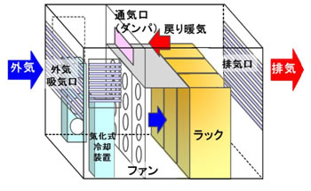 図3、4に試作したコンテナデータセンターの写真と内部構造を示します。外気が平温時(10℃~35℃)は、コンテナ空調ファンで外気吸気口から挿入された空気がラック内部へ送り込まれ、ラック内で暖められた空気が排気口から排出されます。また外気が高温時(35℃以上)は、気化式冷却装置により外気を平温(35℃以下)まで冷やした上でファンに送り込みます。一方、外気が低温時(10℃以下)は、ラックから排出された暖気を、通気口(ダンパ)を通して吸気口に戻して、外気を平温(10℃以上)まで暖めた上でファンに送り込むよう動作します。
