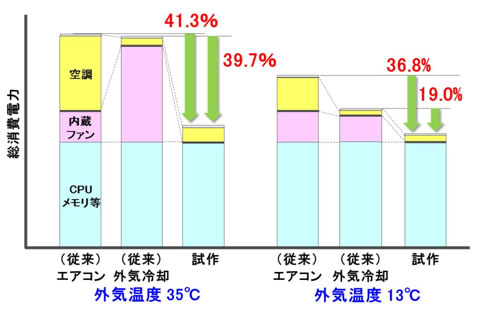 内蔵ファンを持たないサーバを採用し、総消費電力を最大約40%削減
