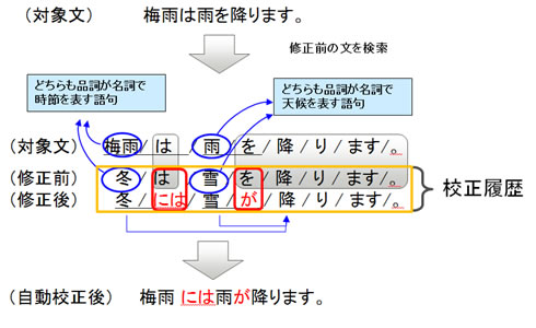 人間の校正した文をそのまま利用することが可能となり、これまで自動修正が困難な誤りも検出し、正しい表現に直すことができるようになりました。たとえば、先ほどの「梅雨は雨を降ります」というような複合的な誤りの例でも、対象文と校正履歴の修正前文章で対応する語句が持っている品詞などを用いて文章間の共通性と意味の近さを評価することで、校正することが可能になります。(図 2)