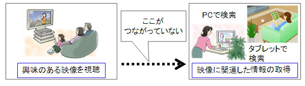近年、ネットワークの高速化やデジタルサイネージの普及などにより、さまざまな場所で映像を目にする機会が増えてきています。しかし、そのほとんどは視聴者に向けて一方的に流されているだけで、画面に映っている映像に関連した情報を直接受け取る手段はなく、視聴者はテレビやデジタルサイネージで映像を視た後にインターネットでその映像に関連した情報を自らキーワードなどを入力し検索しているのが現状です(図1)。
