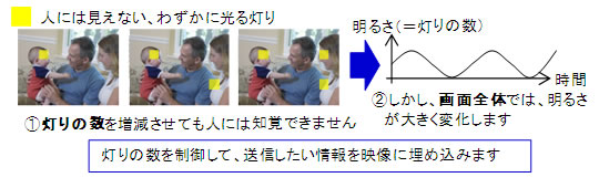 開発した技術は、可視光通信と電子透かしの両方の特徴と利点を兼ね備えた新しい通信技術です。映像に微小な灯りを埋め込み、その微小な灯りの数を増減することにより光通信のような明暗を緩やかに発生させ、情報を送信します。一つ一つの灯りの明るさは人間の目には認識できない程度ですが、これらの数が変わることによって、実際には一つ一つの灯りの総和は大きく変化しています。しかし、時間をかけて徐々に変化させることで急激な明るさの変化を抑えているため、人間の目には知覚できません(図3)。