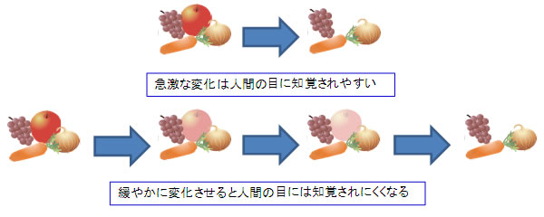 人間は画像の一部が急激に変化した場合はすぐに気がつきます。その一方で徐々に時間をかけて変化をさせた場合は気がつきにくく、開発技術はこの原理を明るさの明暗に応用することで画質の劣化を抑制しています(図4)。