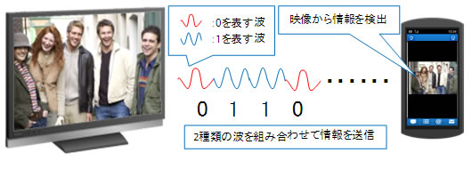 情報を携帯電話に送るためには、明暗のタイミングの異なる2種類の波を用意し、送りたい情報に応じて切り替えながら発信します(図5)。2種類の波の一方が0、もう一方が1を表しており、たとえば通信する情報が「0110」であれば図5のように2つの波を切り替えます。携帯電話側では、撮影した映像から画面の明るさの変化を抽出し、2種類の波が発信されている順番を判定することで情報を読み取ります。1秒で16bitの情報を送ることができ、2~3秒程度の撮影で受信可能です。