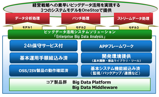 「Enterprise Big Data Analysis」は、ビッグデータ活用に必要なソフトウェアとSI、システムの運用・保守などを統合したソリューションとして、オンプレミス型システムに向けて提供するものです。ビッグデータの分析処理やストリーミング処理など、お客様が求める利用シーンごとに最適化したモデルを月額サービスとして提供します。
