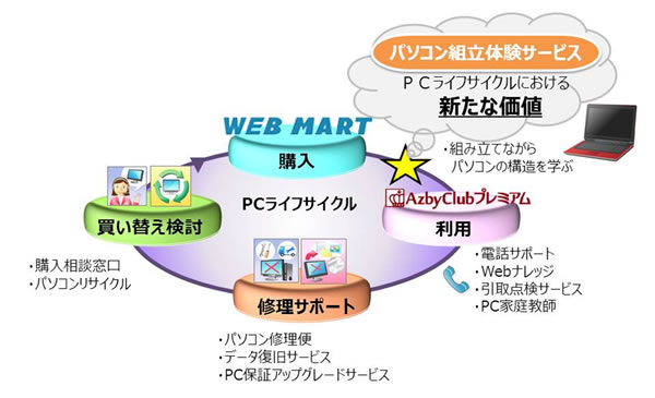 当社では、個人向けパソコンに関して、購入から使い方提案、トラブル解決、リサイクル、買い替えに至るまで、お客様のパソコンライフサイクルをトータルにサポートしてまいりました。当社は、この「パソコン組立体験サービス」を、パソコンを組み立てながらハードウェアの基礎知識を楽しく学んでいただける、新たなサービスとして展開していきます。