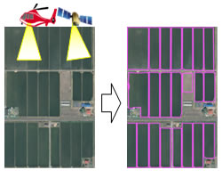 今回の実証実験では、画像の輪郭を強調するフィルター処理と、必要な輪郭を抽出するエッジ抽出の技法を高い精度で統合させた当社独自の画像解析技術を利用し、人工衛星・航空機により撮影した水田の画像から「水田と畦(あぜ)の境界」を認識して水田区画図を自動的に作成します。これを、人手で作成した水田区画図と比較することにより、農業共済業務における実用性を検証します。