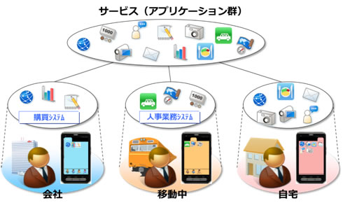 現在、企業情報システムにおけるスマートフォンの業務利用が注目を集める一方で、安全性の確保が導入の課題となっています。今回、クラウドとスマートフォンを連携させることで、必要な時だけスマートフォン上に業務サービスの実行に適した環境を生成し、安全に実行することを可能にしました。これにより、従来企業内ネットワークのみで運用していた業務サービスを、社内外に関わらずスマートフォンで安心して利用できるため、さまざまな現場で業務効率の向上を図ることが期待できます。