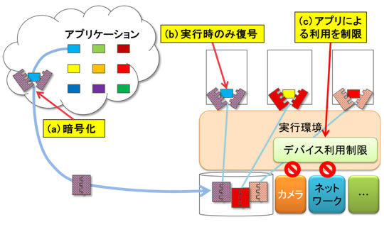 アプリケーションを安全に実行し、スマートフォンに搭載されたカメラやネットワークなどに対して利用制限を行うセキュア実行環境技術を開発しました(図3)。アプリケーションやデータは、あらかじめクラウドで暗号化されスマートフォンに配信されます。スマートフォンでは暗号化されたアプリケーションやデータを実行メモリ上で動的に復号化して実行します。これにより実行メモリ以外には復号化した情報を残しません。また、必要に応じてカメラやネットワークなどに対して利用を制限することで不要な動作を防止することが可能となります。たとえば、メモリカード内に保存されたデータを読み込んでウェブサイトにアップロードする悪意のあるコードがアプリケーション内に埋め込まれていたとしても、あらかじめ設定したウェブサイト以外は利用できないようにしておくことで、その動作を防止することが可能となります。