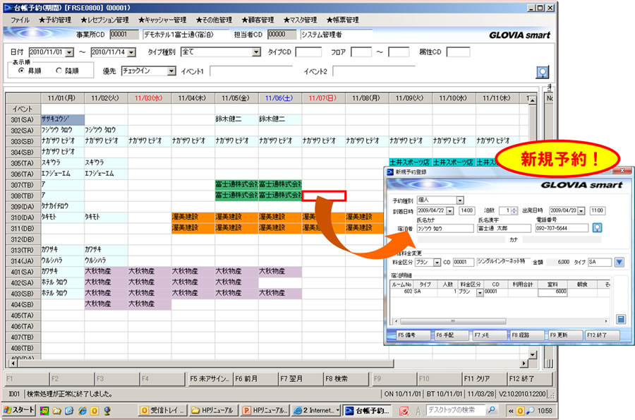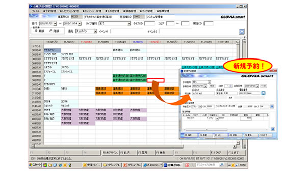 - 予約受付時に指定日・期間の各部屋の予約状況や客室の種類、タイプごとの残室数をリアルタイムで確認できる機能や、割り付けた客室の移動・移動禁止の作業も簡単に行える機能により、受付業務を効率化できます。