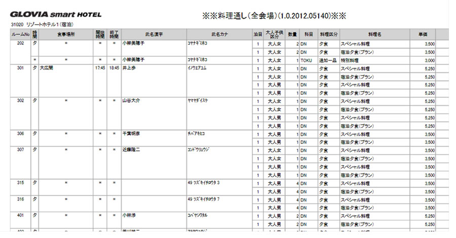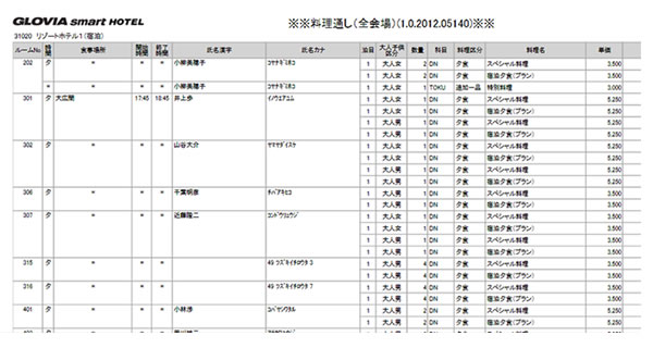 - 宿泊客の夕食・朝食の食事内容や食事会場、食事時間など、食事予約業務全般に対応します。さらには、宿泊予約情報の調理場との共有による食事内容の調整や、出力可能な料理通し表により、調理場・配膳業務も効率化します。