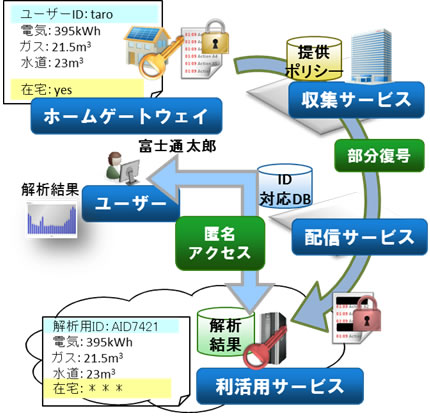 本技術は、1) センサーデータを暗号化したまま、部分的にデータを墨塗りしたり、別のIDや暗号鍵に変更したりする部分復号技術、および 2) ユーザーが利活用先に自分のIDを知らせずに、データの解析結果を取得できる匿名アクセス技術からなります。