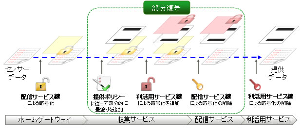センサーデータを暗号化したまま、データ中の一部の値を墨塗りしたり、ユーザーIDや暗号鍵を変更したりすることを可能にするのが部分復号技術です。データがホームゲートウェイを出てから、利活用サービスに着くまで、一度も生データには戻りません(図2)。本技術によって、ユーザーは、利活用サービスごとに、センサーデータの一部を隠したり、IDを別の解析用IDに付け替えるなどの提供ポリシーを指定し、特定の利活用サービスしかデータを見ることができないようにすることで、プライバシーを守ることができます。