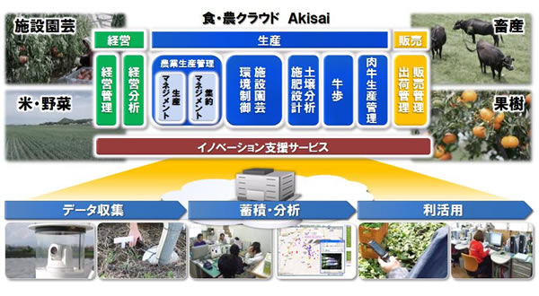 過去3年間の農業現場でのICT利活用実証実験の成果を踏まえ、ICTで農業経営を飛躍的に効率化させる食・農クラウド「Akisai」を、本年10月より順次提供しています。本サービスは、「豊かな食の未来へICTで貢献」をコンセプトに、米・野菜などの露地栽培、施設園芸、畜産において、経営・生産・販売といった農業経営全般を包括的に支援する業界初のクラウドサービスであり、生産現場でのICT活用を起点に、流通・地域・消費者をバリューチェーンで結ぶことを目指します。