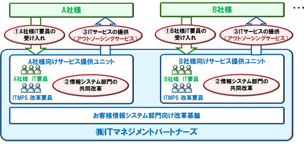 従来、企業の情報システム部門のアウトソーシングでは、アプリケーション開発やシステム運用といったデリバリー領域が主流でしたが、企業経営におけるITの重要性が高まる中で、システム開発や運用に関するマネジメント機能の強化を目的とするアウトソーシングに対するニーズが高まりつつあります。当社はこれまで、マネジメント領域のアウトソーシング受託において、お客様ごとに個別の合弁企業を設立して事業を展開してきましたが、昨今の高まるニーズを受け、お客様が多額の投資をすることなく、簡便にマネジメント領域のアウトソーシングができるよう、主に中堅市場のお客様を対象にITマネジメントのアウトソーシングサービスを提供するITマネジメントパートナーズを設立しました。