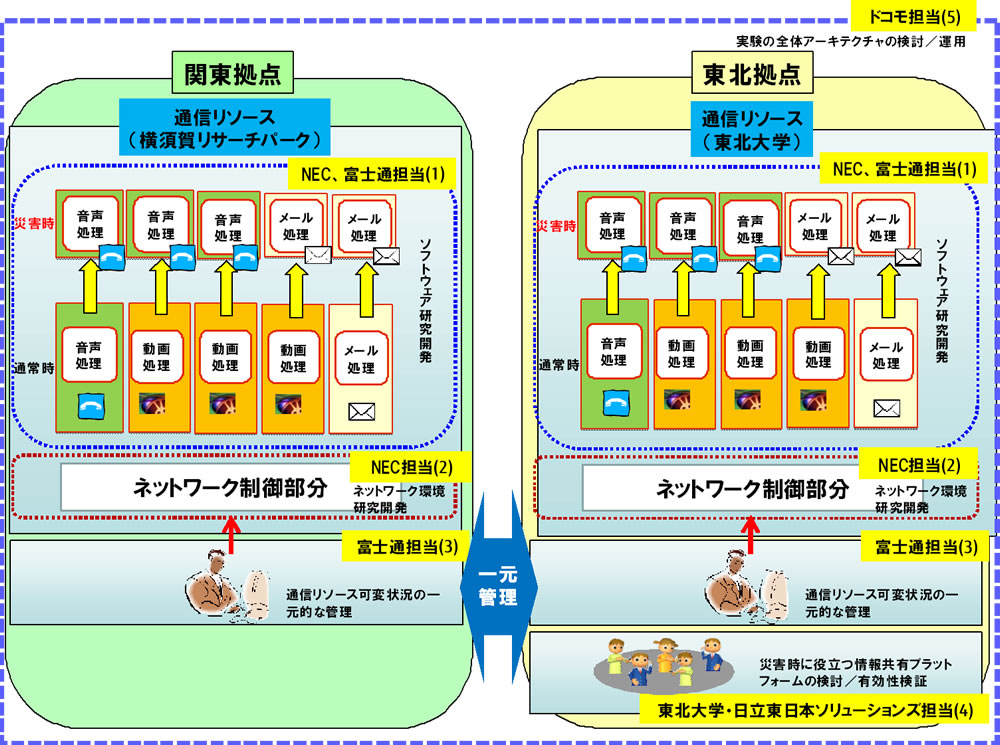 株式会社エヌ・ティ・ティ・ドコモ(以下、ドコモ)、国立大学法人東北大学(以下、東北大学)、日本電気株式会社(以下、NEC)、株式会社日立東日本ソリューションズ(以下、日立東日本ソリューションズ)、富士通株式会社(以下、富士通)は、大規模災害時に発生が予想される通信混雑時に、安否確認等で最も利用される音声通話やメールを優先的に通信しやすくする技術について、本日、東北大学(宮城県仙台市)の研究施設へ実験に必要な設備の構築を完了しました。同時に、すでに構築している横須賀リサーチパーク内にある研究施設とともに行う実証実験を来年1月から開始するために、それぞれの施設でのシステム結合試験を開始いたしました。