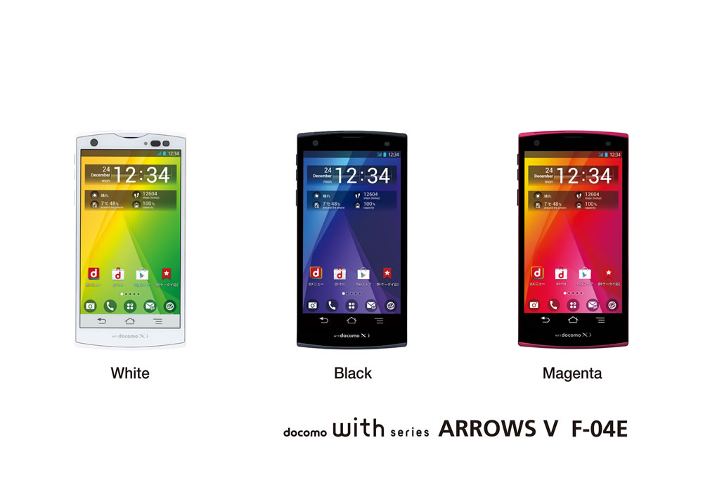 通信速度の向上によりハイビジョン動画や本格ゲームなど、大容量データを活かしたリッチコンテンツサービスが急速に拡大するなか、スマートフォンにはこうしたリッチコンテンツを存分に楽しむための高性能CPUや大容量メモリの搭載が求められています。これらのニーズにお応えするため、当社はクアッドコアCPUとdocomo LTE「Xi」対応でサクサク快適な操作感を実現し、映像や音楽やゲームなどのリッチコンテンツをとことん保存できる大容量メモリを搭載したハイスペックスマートフォンの「ARROWS V F-04E」を開発しました。カラーは、「White」「Black」「Magenta」の3色です。