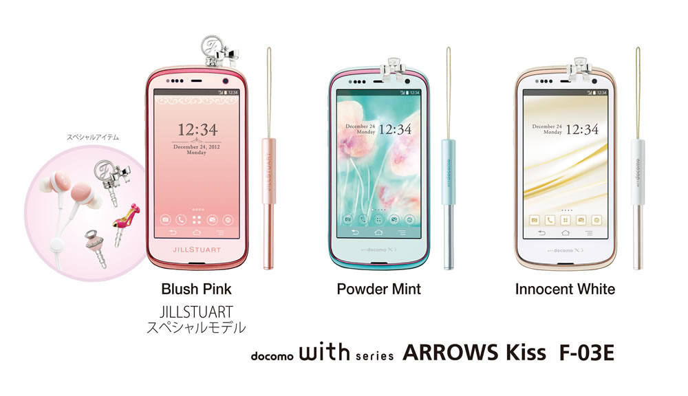 スマートフォン利用者が増えさまざまなデザインの端末が販売されるなか、特に女性を中心に、手になじむサイズ感で華やかなデザインかつスペックの充実した機種が求められています。このようなニーズにお応えするため、当社はSweetなカラーとデザインに、サクサク快適なインターネット閲覧が楽しめるdocomo LTE「Xi」対応や、あざやかで綺麗な写真が簡単に撮れる高性能カメラ、気になったアプリや撮った写真をたっぷり保存できる大容量メモリなど、可愛いだけじゃない、ハイスペックを詰め込んだスマートフォンの「ARROWS Kiss F-03E」を開発しました。カラーは、「JILLSTUART」コラボレーションモデルの「Blush Pink」と、「Powder Mint」「Innocent White」の3色です。