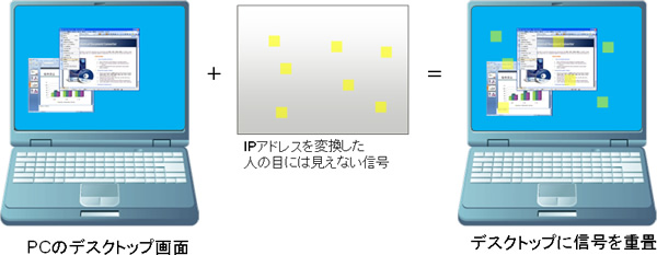 通信情報を目に見えないようにPC画面にリアルタイムで重畳する技術です。通信情報とはIPアドレスやSSID、もしくはそれらに関連付けされたIDなど、ネットワーク上にあるPCを識別するための情報です。通信情報の重畳には映像媒介通信技術を使用しています。映像媒介通信技術とは映像に微小な灯りを重畳し、その微小な灯りの数を増減させることにより光通信のような明暗を緩やかに発生させて情報を送信する技術です。この技術を用いて通信情報を人の目には見えない信号に変換して、PCのデスクトップに重畳しています。デスクトップ上で重畳しているため、オリジナルのファイルには手を加える必要はありません。本技術により、PC画面を携帯電話のカメラで撮影するだけで被写体のPCを特定します。