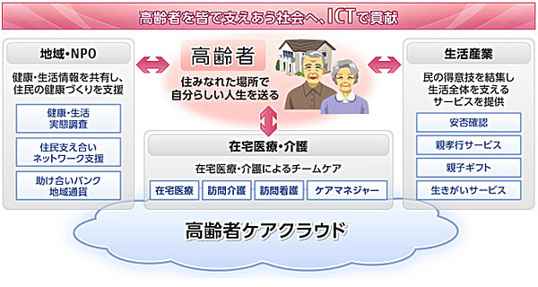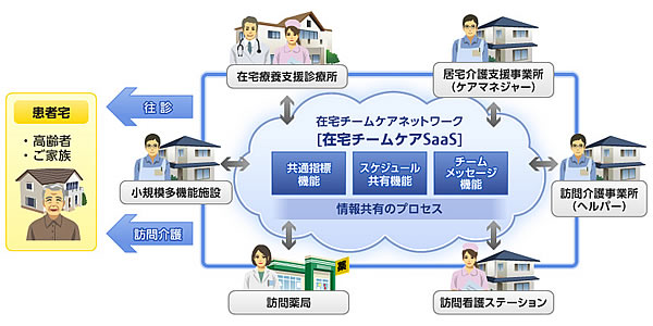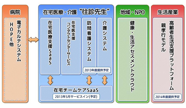 当社は、ICTを活用することで、より質の高い「在宅医療・介護」を実現するべく、過去2年間の在宅医療・介護現場や東日本大震災の被災地での高齢者ケアにおけるICT利活用実証の成果を踏まえ、高齢者ケアに従事する医療・介護・地域の関係者を支援するクラウドサービスを体系化し、順次提供してまいります。
