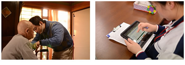 画像:住みなれた自宅で診療をする在宅医師(左)、利用者のバイタル情報などを入力するケアマネジャー(右)