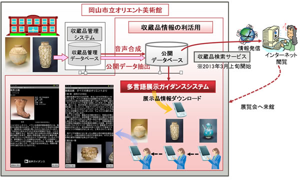 当社は、公立では国内唯一の専門美術館である岡山市立オリエント美術館(所在地:岡山県岡山市、館長:谷 一尚、創立:1979年、以下、オリエント美術館)様と共同で、収蔵品管理データベースに登録されている制作時期、地域、紹介文などの文化財情報を、音声合成技術を利用して来館者向けの多言語展示ガイダンスに自動作成するシステムを構築しました。オリエント美術館様は、本システムを利用し、日本語と英語に対応した「多言語展示ガイダンスサービス」を2013年2月26日より開始します。